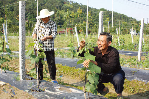 二、精細整地施肥,提高栽植質量。地塊選好耕翻整平后,按預定行株距挖坑,坑的上口徑80厘米,底部口徑40厘米。栽前適當修剪苗子的根系和枝梢,根系應盡量多保留,及時用護樹將軍浸泡根系,殺菌消毒。每坑施用有機肥30-40千克、尿素0.5千克,均勻撒入坑底后,回填10厘米厚的土,每坑栽植1株葡萄苗,填土壓實后灌一次透水,噴施新高脂膜800倍液防止病菌侵染,提高抗自然災害能力,縮短緩苗期,水滲后適時用土把坑覆平。